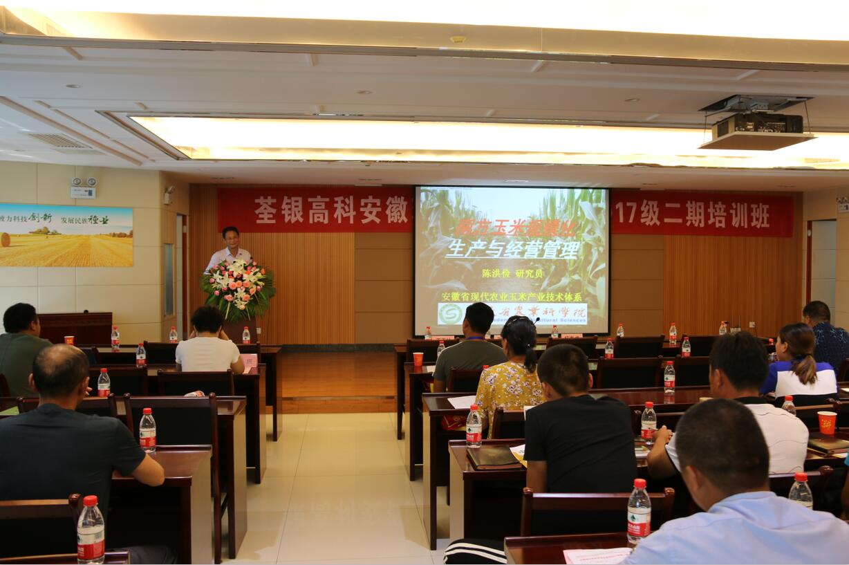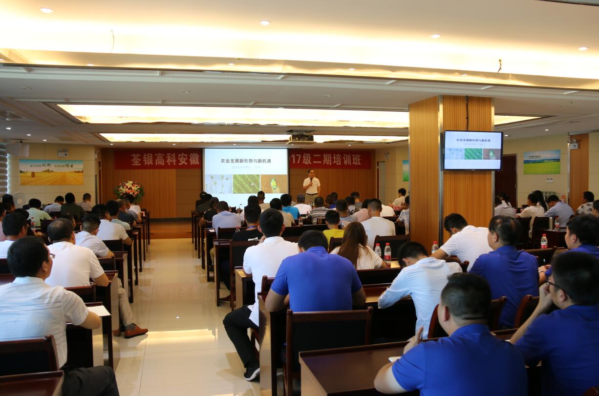 ??? 2018年7月19日,由安徽省農(nóng)委主辦、荃銀高科承辦的安徽現(xiàn)代青年農(nóng)場(chǎng)主培訓(xùn)2017級(jí)第二期培訓(xùn)活動(dòng)在公司六樓多功能廳展開(kāi)。安徽荃銀高科董事長(zhǎng)張琴、營(yíng)銷總監(jiān)王玉林,培訓(xùn)班總教務(wù)長(zhǎng)楊惠成老師,安徽張海銀基金會(huì)秘書長(zhǎng)張彤,及來(lái)自全省各地的100多位從事種植業(yè)的農(nóng)場(chǎng)主學(xué)員參加了培訓(xùn)。